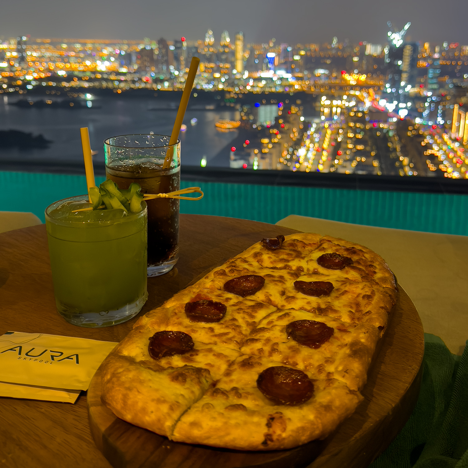 Die Speisekarte des Aura Skypools ist ebenso exklusiv wie die Location selbst. Ich probiere einen der asiatisch inspirierten Cocktails und genieße dazu eine Auswahl an leichten Tapas und Fladbreats. Alles wird mit viel Liebe zum Detail serviert und macht den Aufenthalt noch besonderer.